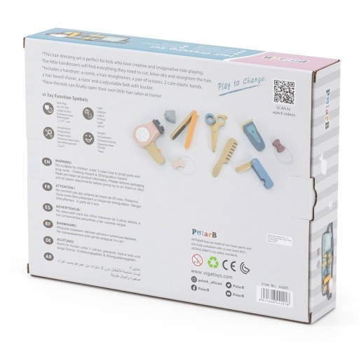 Ten zestaw fryzjerski od marki VIGA jest idealny dla dzieci, które uwielbiają wykorzystywać moc swojej kreatywności i wyobraźni poprzez różne zabawy w odgrywanie ról. Mali fryzjerzy znajdą tu wszystko co mogą potrzebować do zabawy w ścinanie, suszenie czy prostowanie włosów. Znajdziemy tu suszarkę, grzebień, prostownicę, nożyczki dwie słodkie elastyczne gumki do włosów, maszynkę do strzyżenia, brzytwę oraz regulowany pas, w którym dzieci mogą zabrać cały zestaw i trzymać zawsze pod ręką. Zabawki zostały wykonane w bezpieczny dla dzieci sposób z drewna przy użyciu nietoksycznych farb.