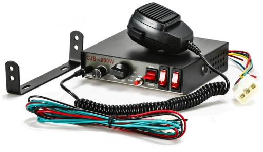 Wysokiej jakości syrena policyjna z megafonem o mocy 200W. Urządzenie posiada wbudowane 8 dźwięków. Gruszkę z elastycznym przewodem montuje się w wygodnym uchwycie.