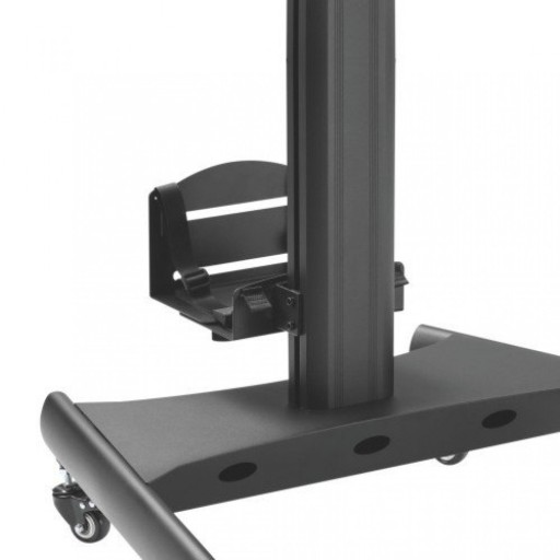Wspornik montażowy dostosowuje wysokość i przechylenie, aby umożliwić znalezienie idealnego kąta widzenia. Szeroka konstrukcja podstawy zapobiega przechylaniu się stojaka, a dolna półka zapewnia dużo miejsca na odtwarzacz DVD lub inny sprzęt AV.