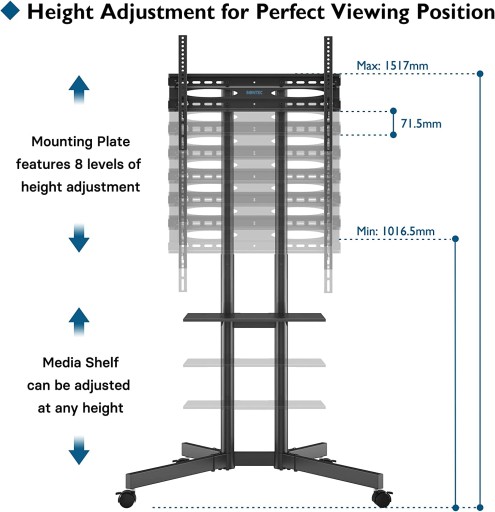- Wspornik montażowy można przechylać w górę i w dół o 15 stopni posiada 8 poziomów regulacji wysokości od 1016,5 mm do 1517 mm (każda wysokość może być regulowana o 71,5 mm), aby zapewnić optyczny kąt widzenia, jest wyposażony w solidną półkę na nośniki do przechowywania laptopa, DVD lub systemu do gier, półkę można również regulować na dowolnej wysokości