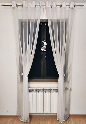 Zawieszka posiada na górze haczyk umożliwiający prosty montaż na każdym rodzaju karnisza (można ją zawiesić na kółku, złapać żabką lub agrafką) a także bezpośrednio na firance lub zasłonce.