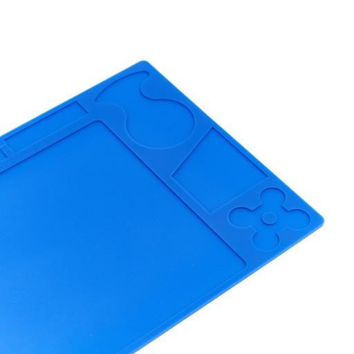 Wysokiej jakości mata silikonowa z wyprofilowanymi przegródkami poprawiająca komfort pracy w każdym serwisie. Antystatyczne właściwości oraz specjalne przegrody umożliwiają organizowanie i segregację elementów elektronicznych, śrubek itp. podczas pracy. Duża płaska powierzchnia oraz odporność na wysoką temperaturę pozwala na lutowanie płyt, ekranów położonych bezpośrednio na macie. Mata odporna na bardzo wysoką temperaturę do 500 ° C, pozwala na lutowanie bezpośrednio na niej. Wyposażona została w kilka różnych przegródek gdzie można umieścić np. śrubokręty, śruby, topniki, cynę, oraz inne małe elementy wykorzystywane w serwisie. Idealnie sprawdzi się do serwisów zajmujących się naprawą telefonów komórkowych, tabletów, komputerów, oraz innych miejsc gdzie potrzebna jest porządna mata antystatyczna z odpornością na wysoką temperaturę. Matę można czyścić wodą, alkoholem izopropylowym, lub innym płynem do czyszczenia płyt PCB. Mata została wyposażona w organizery co pozwala na utrzymanie swojego miejsca pracy w idealnym porządku, wszystkie śrubki, czy inne metalowe komponenty będą w jednym miejscu.