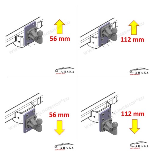 Przy użyciu tego artykułu kule można zamontować niżej, wyżej lub na tym samym poziomie. Dzięki zamocowaniu kuli na poziomie otworów w haku zwiększy się dystans pomiędzy kulą a powierzchnią mocującą. Szczególnie przydatny przy niektórych bagażnikach rowerowych lub zaczepach AL-KO które wymagają większego odstępu kuli od haka holowniczego.