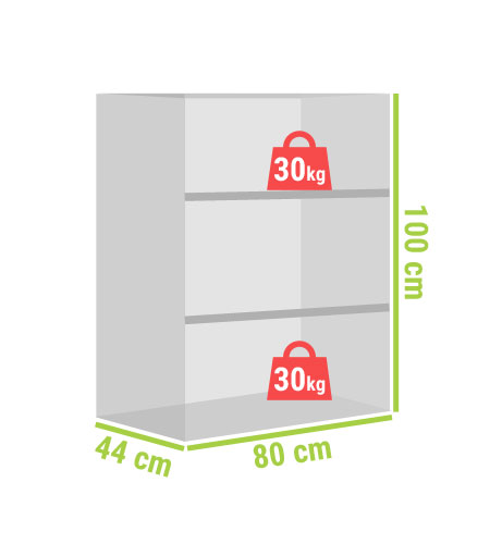 Wewnątrz szafy znajdują się dwie duże półki, na których można postawić przedmioty o wadze do 30 kg.