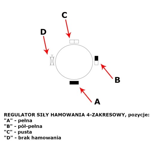 ✅ Regulator siły hamowania posiada 4 pozycje: pełną, pół-pełną, pustą i brak hamowania (odhamowanie).