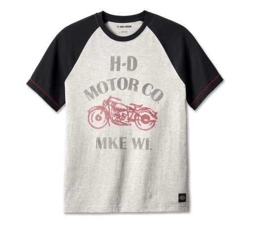 Wykonana z wysokiej jakości bawełny koszulka męska o klasycznym fasonie z limitowanej edycji. Posiada okrągły dekolt. Wyróżnia się oryginalną grafiką przedstawiającą jeden z najwcześniejszych modeli Harleya Davidsona .