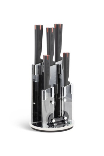 Zestaw 5 noży ze stali węglowej z ostrzałką oraz nożycami w praktycznym i estetycznym, obrotowym stojaku! Praktyczne i wygodne noże z wysokiej jakości ostrzami, które nie wymagają ponownego ostrzenia przez bardzo długi czas użytkowania. Nowoczesne noże, które idealnie sprawdzą się podczas krojenia, siekania oraz porcjowania mięsa.