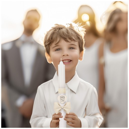 Nasza Świeca na Pierwszą Komunię Świętą to bardzo symboliczny i osobisty element, który uświetni ten wyjątkowy moment. Świeca została starannie wykonana i ozdobiona eleganckim, białym materiałem na całej swojej długości. Zarówno dolna, jak i górna część świecy zostały pięknie wykończone delikatną bawełnianą opaską, nadając całości wyjątkowego charakteru.