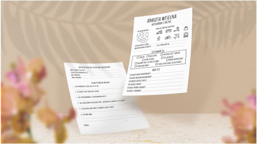 Gotowe ankiety weselne dla gości możesz umieścić tuż obok winietek na stołach wraz z koszykiem długopisów, tak by każdy z gości mógł błyskawicznie je uzupełnić. Możesz je również postawić obok Instaxa czy Fotobudki. Stanowią one też część atrakcji weselnych.
