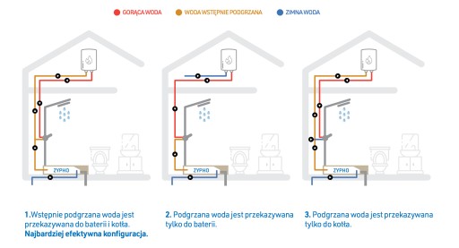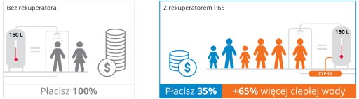 - Zimna woda po ogrzaniu przez rekuperator trafia do podgrzewacza, a dzięki wyższej temperaturze wymaga jedynie dogrzania, obniżając w ten sposób wykorzystanie niezbędnej energii cieplnej.