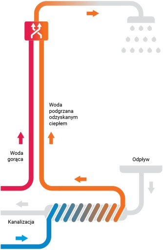 - woda która ucieka po myciu do kanalizacji nagrzewa wymiennik ciepła - rekuperator