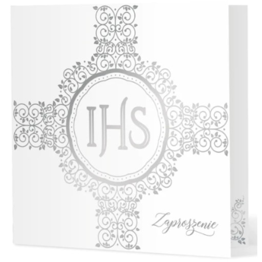 ✔️ Na pierwszej stronie zaproszenia na komunię i uroczyste przyjęcie znajduje się hostia z napisem IHS wpisana w piękny, koronkowy motyw tworzący kszt.ałt krzyża.