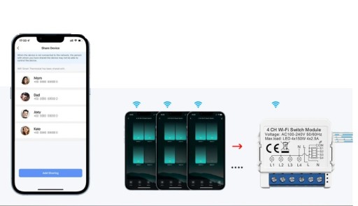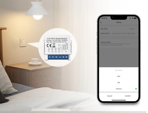 Dopuszkowy moduł Wi-Fi zaprojektowany, aby zmienić tradycyjny wyłącznik lub gniazdko w inteligentne urządzenie sterowane za pomocą telefonu! Moduł współpracuje z tradycyjnymi włącznikami (bi-stabilnymi), eliminując konieczność ich wymiany na włączniki chwilowe (monostabilne). Nawet po ręcznym włączeniu lub wyłączeniu światła, użytkownik za pomocą aplikacji może sprawdzić czy światło jest włączone, czy wyłączone.