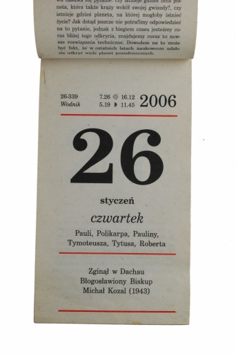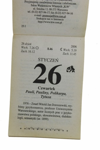 Tu kupisz kartkę wyrwaną z oryginalnego kalendarza zdzieraka z 2006 roku. Dzień i miesiąc oczywiście wybierzesz sam(a). Nie zapomnij podać daty w "uwagach do zakupu". Przykładowa kartka na zdjęciu obok.