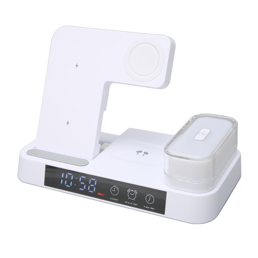 1. Urządzenie wielofunkcyjne 4 w 1: zawiera podstawkę z bezprzewodową ładowarką 4 w 1, cyfrowy budzik i regulowaną 7-kolorową lampkę nocną. Stacje ładujące dla wielu urządzeń, dla iPhone'ów, smartfonów, iWatchów i słuchawek.