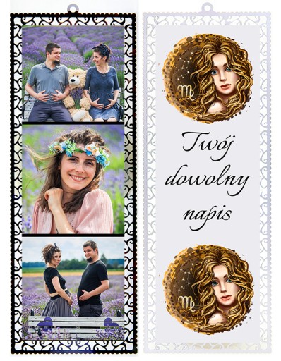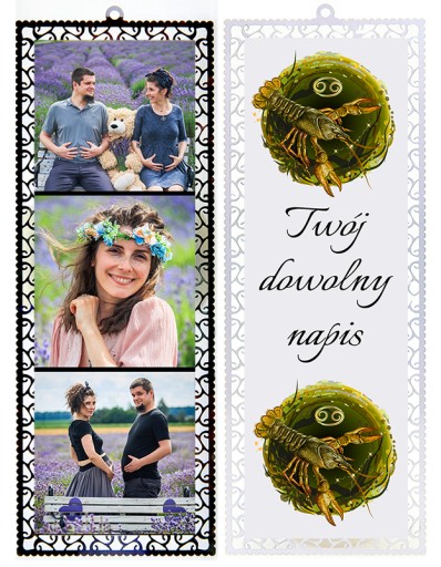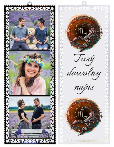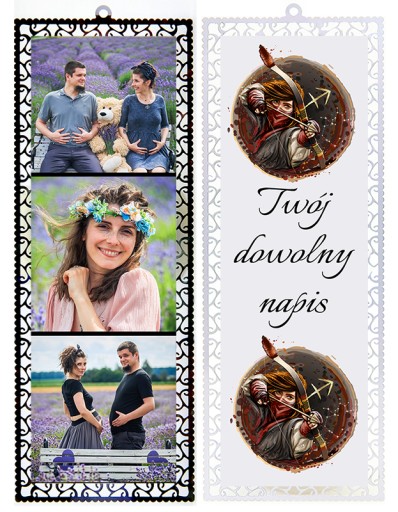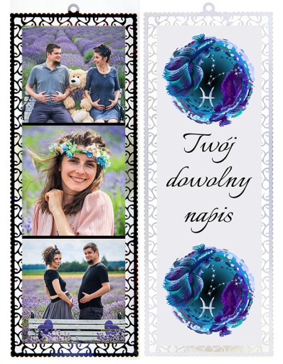 - Z jednej strony stały nadruk ( ZNAK ZODIAKU) do wyboru poniżej + DOWOLNY NAPIS, z drugiej Twoje fotografie.