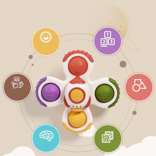 -Trzy połączone obrotowe zabawki z przyssawką, unikalny wzór, z astronautą, statkiem kosmicznym i rakietą. Z przodu znajdują się figury geometryczne, a z tyłu cyfry, które mogą rozwijać zdolności sensoryczne i zdolność rozpoznawania liczb.