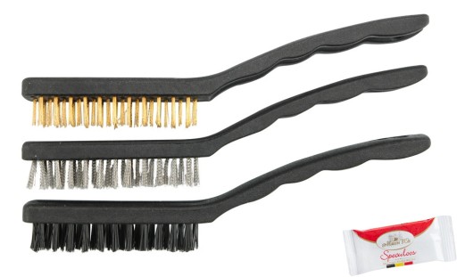 Zestaw trzech szczotek technicznych wykonanych z ocynkowanego drutu stalowego, drutu mosiężnego i nylonu. Korpusy szczotek wykonane z twardego tworzywa.