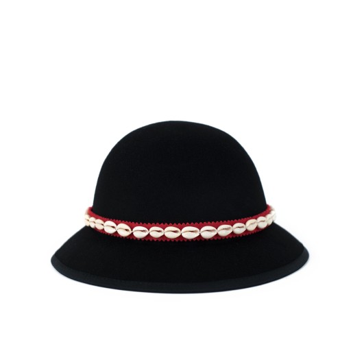 Ozdobiony piórkiem i taśmą z muszelek (w razie potrzeby można je zdjąć - nie są przytwierdzone do kapelusza).