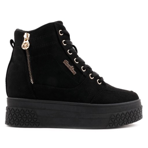Sneaksery damskie osadzone na grubej podeszwie, w środku ukryta koturna 3 cm. Cholewka sięgająca za kostkę. Wykonana z ekologicznego zamszu. Udekoroana od zwenetrznej strony złotym suwakiem. Zapinane od wewntrznej strony na zamek błyskawiczny, dodatkowo wyposażone w sznurowadła.