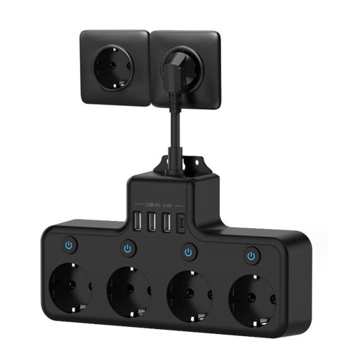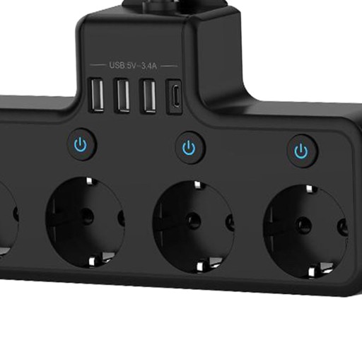Listwa zasilająca z wtyczką EU, 1 porty typu C z 3 portami USB, elektryczne czarne