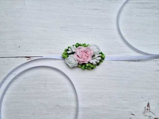 Korsarz na rękę wiązany na ręce wstążeczką. Kwiatuszki od spodu zabezpieczone są delikatnym filcem.