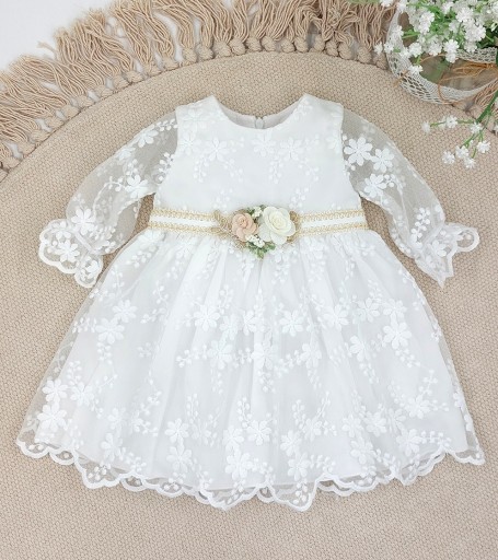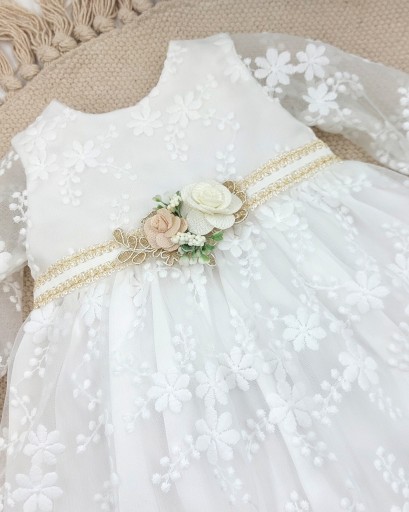 Ozdobą sukienki jest pas ,z kompozycją kwiatową w kolorach: beż, ecru, „stare złoto”, zieleń