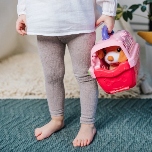 Transporter pozwoli na zabawę w odgrywanie roli opiekuna zwierzaczka bawiąc się piłką, miską, grzebieniem czy butelką. Pluszowy szczeniaczek może być przytulany, czesany, głaskany i mieści się w transporterze.