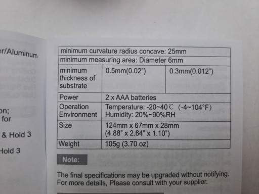 - Miernik wykorzystuje precyzyjną zintegrowaną sondę i wykorzystuje zasady indukcji magnetycznej oraz efekt prądów wirowych, który automatycznie wykrywa właściwości podłoża.
