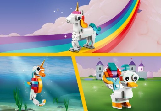 Dzięki trzem różnym magicznym stworzeniom, które mali konstruktorzy mogą złożyć w ramach zabawy tym zestawem LEGO Creator 3 w 1, mityczne przygody nigdy się nie kończą. Dzieci mogą zbudować ruchomego magicznego jednorożca, przerobić go na konika morskiego na podstawce imitującej dno morskie lub zamienić go w ruchomego magicznego pawia z kolorowym ogonem, a nawet użyć klocków do stworzenia zupełnie innego uroczego stworzenia.