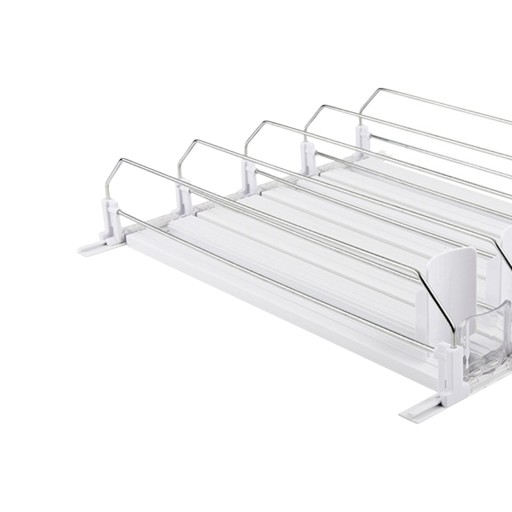 [Komponent] Dozownik puszek do lodówki składa się z przednich i tylnych prętów mocujących, popychacza i separatora.
