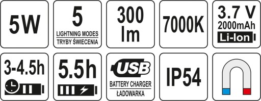 REFLEKTOR COB LED AKUMULATOR PRZENOŚNY 5W 100x65x30 MM MAGNES 4 TRYBY YATO YT-81819