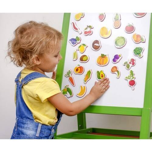 Ten zestaw magnesów to doskonały sposób na naukę o owocach i warzywach, rozwijanie zdolności językowych i kreatywności, a także rozwijanie małej motoryki.