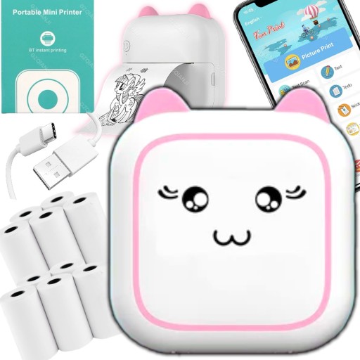 МИНИ-ТЕРМОПРИНТЕР DRUKUŚ МИНИ-КОТ ДЛЯ НАКЛЕЙКИ ФОТОГРАФИЙ + 11 ШТ. РОЛИКОВ