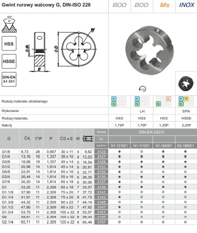 Narzynka HSS 800 zgodna z DIN-EN 24 231 nacina gwint rurowy walcowy.Materiał, z jakiego została zrobiona narzynka - wysokowydajna stal szybkotnąca - charakteryzuje się wysoką odpornością na zużycie. Narzynka jest przeznaczona do stali konstrukcyjnych węglowych, automatowych i niskostopowych o wytrzymałości 600MPa<=Rm<=800MPa. Przed użyciem narzynki należy na elemencie obrabianym wykonać sfazowanie 45° w celu uniknięcia większych obciążeń krawędzi tnących. Narzynka powinna być ustawiona prostopadle względem śruby. Aby obciążenie zębów podczas obróbki było niższe, średnica pręta musi by zawsze mniejsza niż średnica zewnętrzna gwintu na narzynce.