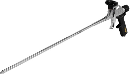 Pistolet do pianki pu z lancą o długości 500 mm. Korpus odlany z aluminium. Posiada duże wygodne w użyciu pokrętło regulacji wypływu piany. Rękojeść wykończona dwukomponentowym tworzywem . Zawór główny z nierdzewną kulką stalową , kosz mocujący pistoletu pokryty warstwą ptfe./ zmniejsza on przyleganie piany, skraca czas potrzebny na czyszczenie pistoletu /. Lanca o długość 500 mm ułatwia aplikacje piany w miejsca o utrudnionym dostępie.