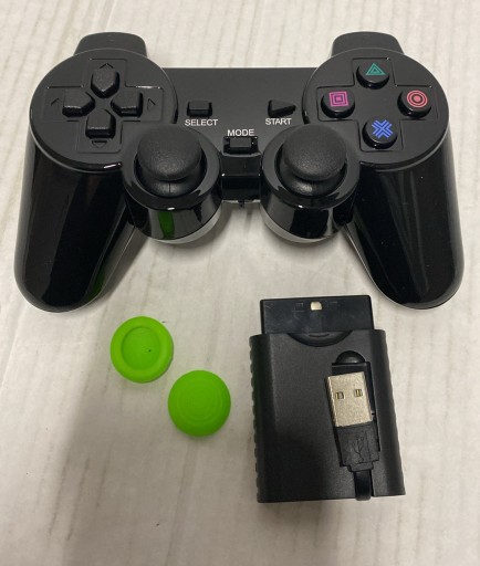 Funkcje Najnowocześniejsza technologia bezprzewodowa 2,4 GHz, koniec ze splątanym przewodem. Użyj 2 baterii AAA (brak w zestawie) Podwójne wibracje wstrząsowe Ergonomiczne drążki analogowe i pad kierunkowy zapewniają doskonałą kontrolę Funkcja automatycznego wykrywania upraszcza konfigurację Pakiet zawiera dwa kontrolery i dwa odbiorniki Nowiutki Zawartość pakietu DWA kontrolery bezprzewodowe PS2 DWIE pary zielonych uchwytów na kciuk.