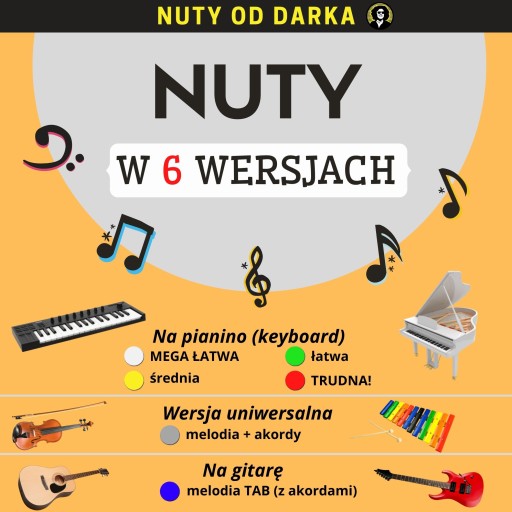 Nuty literowe są dostępne w wersji MEGA ŁATWEJ (sama prawa ręka + najprostsze akordy). We wszystkich wersjach na instrumenty klawiszowe masz podpisane palce w wielu miejscach danego utworu. W wersji łatwej, średniej i TRUDNEJ! odnajdziesz także właściwe oznaczenia dynamiczne, artykulacyjne, itp. Wersja melodia + akordy (po ang. Lead Sheet) to specjalne opracowanie, w której masz samą melodię oraz odpowiednie akordy - można ją wykorzystać na różne instrumenty - od fletu, gitarę po akordeon czy dzwonki! W wersji gitarowej (melodia TAB, czyli tabulatura) masz także podpisane właściwe chwyty wraz z diagramami na samym początku opracowania!