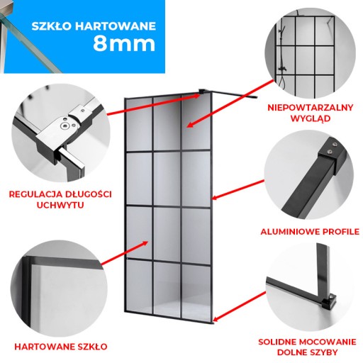 ŚCIANKA PRYSZNICOWA CZARNA 130x200 CM SZKŁO 8 MM