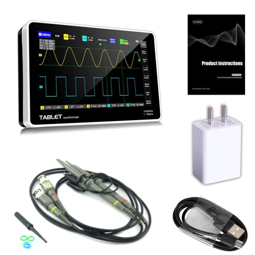 Specyfikacja techniczna: - Pasmo analogowe: 100MHz * 2 - Liczba kanałów: 2 - Maksymalna szybkość próbkowania w czasie rzeczywistym: 1GSa/s - Czułość wertykalna: 50 mV/div ~ 500 V/div - Zakres podziałki czasowej: 50S/div ~ 10nS/div - Maksymalne napięcie testowe: 40 V (sonda 1X), 400 V (sonda 10X) - Pamięć: 240Kbit - Opór wejściowy: 1MΩ - Precyzja ADC: 8 bitów - Tryb sprzężenia: AC/DC - Tryb wyzwalania: pojedynczy, normalny, automatyczny - Zakres napięcia wyzwalania zewnętrznego: 0-40 V - Wyświetlacz: 7 calowy ekran LCD TFT - 800*480 - Obsługa: ekran dotykowy pojemnościowy - Interfejsy: USB - Zasilanie: bateria litowa 6000 mAh - Wymiary: 184 mm x 124 mm x 50 mm - Waga: 650g