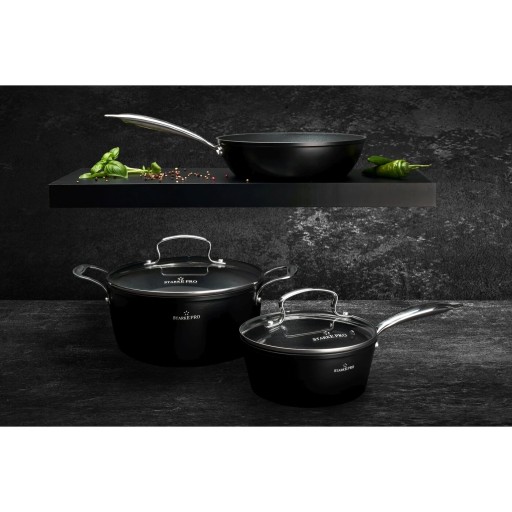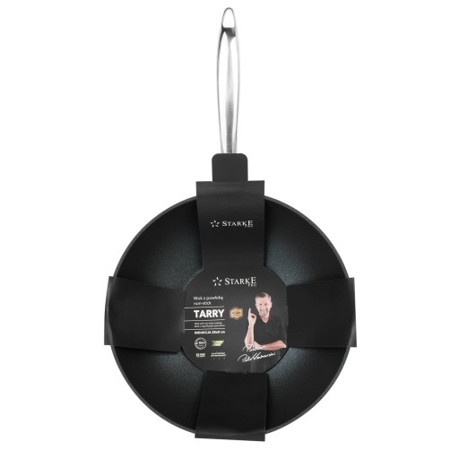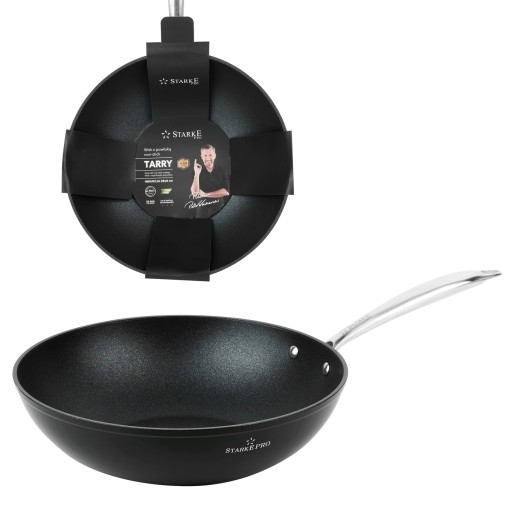 Głęboka patelnia nieprzywierająca WOK na indukcję Starke Pro Tarry 27,5 x 8 cm jest aluminiowa, ma grube ścianki i chroni jedzenie przed przywieraniem. Jej korpus wykuto na gorąco z pojedynczego arkusza metalu techniką forged. Dzięki temu jest bardzo solidna oraz dobrze przewodzi ciepło. Jest też świetnie wyważona, co w połączeniu z nierdzewnym uchwytem nitowanym (odlew die cast) da ci wysoki poziom komfortu użytkowania. Produkt działa na każdym typie kuchenki, ponieważ ma dno indukcyjne. Sprawia ono, że robienie posiłków jest szybsze, a przy tym energooszczędne. Ułatwia też mieszanie składników. Trwałość powierzchni smażenia patelni WOK Tarry opiera się na dwuwarstwowej powłoce non-stick AEROLITE (grubość 50-65 mikrometrów). Nie zawiera szkodliwych substancji (np. PFOA), jest twarda, charakteryzuje się doskonałą przyczepnością i naturalną fakturą oraz może znieść do 50 000 cykli ścierania. Kolekcja Starke Pro Tarry była testowana także przez zawodowego szefa kuchni, Piotra Kucharskiego. Poleca on ją do wieloletniego użytku domowego.