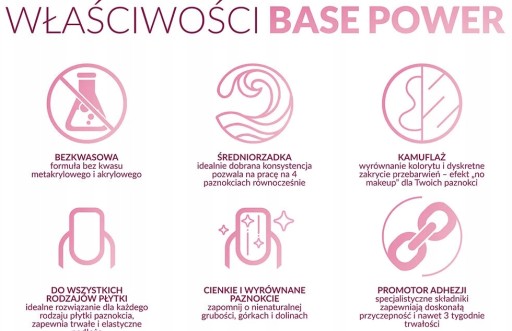 Baza jest bezkwasowa ( nie zawiera kwasu metakrylowego i akrylowego ) SPRAWDZI SIE WIĘC PRZY WRAŻLIWEJ I BARDZO DELIKATNEJ PŁYTCE PAZNOKCIA TZW. PROBLEMATYCZNEJ PŁYTCE