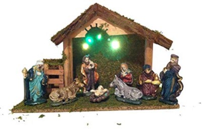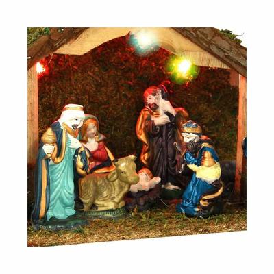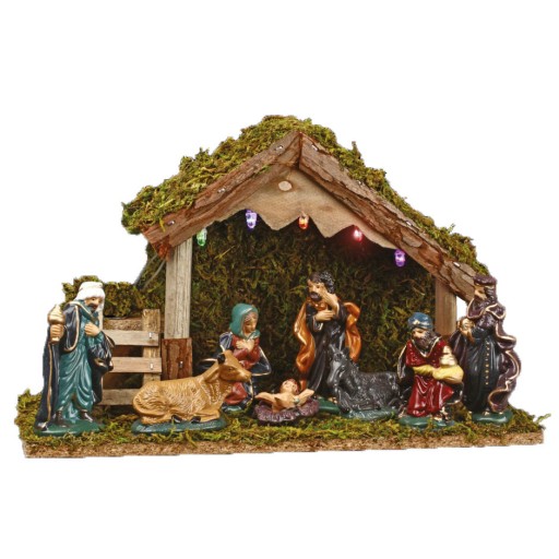 Zestaw bożonarodzeniowy składający się z szopki, 8 figurek oraz oświetlenia LED zasilanego bateriami.
