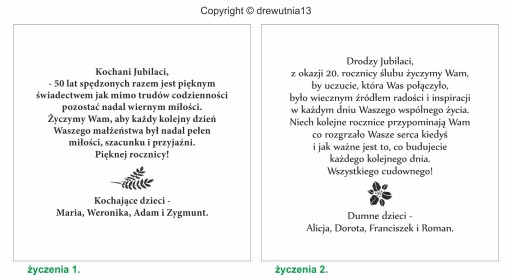 Możesz przesłać nam swoje własne życzenia do wygrawerowania w środku. Pamiętaj tylko aby dokładnie sprawdzić tekst, który nam wyślesz - czy gdzieś nie wkradł się błąd lub literówka - wygrawerujemy dokładnie to, co nam prześlesz.