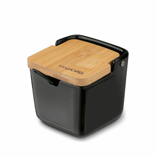 Cukiernica z łyżeczką i pokrywką bambusową Konighoffer Ceramic 270 ml została wykonana z czarnej porcelany NBC. Produkt możesz też wykorzystać jako kuchenny pojemnik np. na sól lub kakao. Wymiary cukiernicy to 9,3 x 9,3 x 9 cm, a jej kształt jest regularny. Ułatwia to przechowywanie modelu. Z nim uzupełnisz zastawę deserową w elegancki sposób. Rozbudujesz również domowy zestaw porcelanowych pojemników kuchennych. Dołączona łyżeczka również jest porcelanowa. Możesz myć ją razem z cukierniczką, ale bez drewnianej pokrywki, w zmywarce.