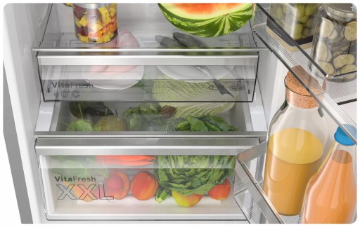 Przestronna strefa VitaFresh XXL <0°C> oferuje idealne warunki do przechowywania świeżej żywności. Utrzymuje temperaturę niższą dla mięsa i ryb oraz zapewnia wyjątkową świeżość owocom i warzywom w szufladzie z perfekcyjnie dobranym poziomem wilgotności. Owoce i warzywa dzięki odpowiednim warunkom będą w dobrej kondycji zachowując cenne witaminy i pozostaną świeże na dłuższy czas. Więcej jedzenia, mniej marnowanego jedzenia!