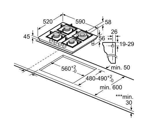- Wymiary niszy (WxSxG): 585 mm - 595 mm x 560 mm - 568 mm x 550 mm