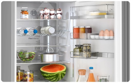 Stwórz wnętrze odpowiadające Twoim potrzebom i uporządkuj Swoją lodówkę tak, jak chcesz. Flex Interior zapewnia dużą ilość elastycznych rozwiązań, takich jak Flex Trays i Flex Shelf. Zmień układ półek w drzwiach tak, jak tego potrzebujesz, dzięki trzem dzielonym półkom, które można ustawić na wiele sposobów. A dzięki Flex Shelf nie będzie kłopotliwe przechowywanie wysokich przedmiotów, takich jak butelki lub inne nieporęczne przedmioty, takie jak duże garnki. Po prostu przesuń i złóż półkę. Przechowywanie artykułów spożywczych nigdy nie było tak proste.