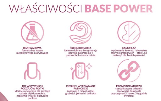 Baza jest bezkwasowa ( nie zawiera kwasu metakrylowego i akrylowego ) SPRAWDZI SIE WIĘC PRZY WRAŻLIWEJ I BARDZO DELIKATNEJ PŁYTCE PAZNOKCIA TZW. PROBLEMATYCZNEJ PŁYTCE