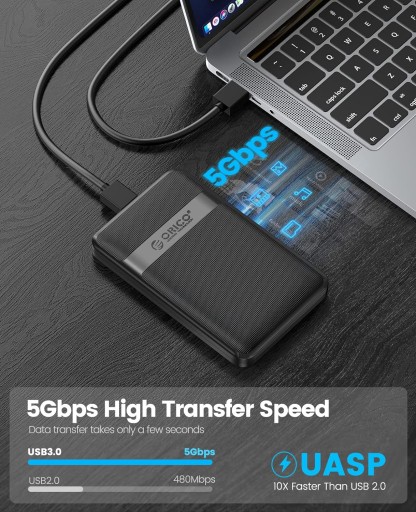 wysoka prędkość. Obudowy dysków twardych SATA 3.0 na USB 3.0 osiągają prędkość transferu do 5 Gb/s, a dzięki UASP mogą być o 70% szybsze niż zapewnia zwykła obudowa USB 3.0 po podłączeniu do urządzenia obsługującego UASP. Kompatybilny z portami USB 2.0 lub 1.1.
